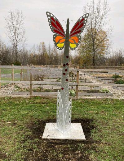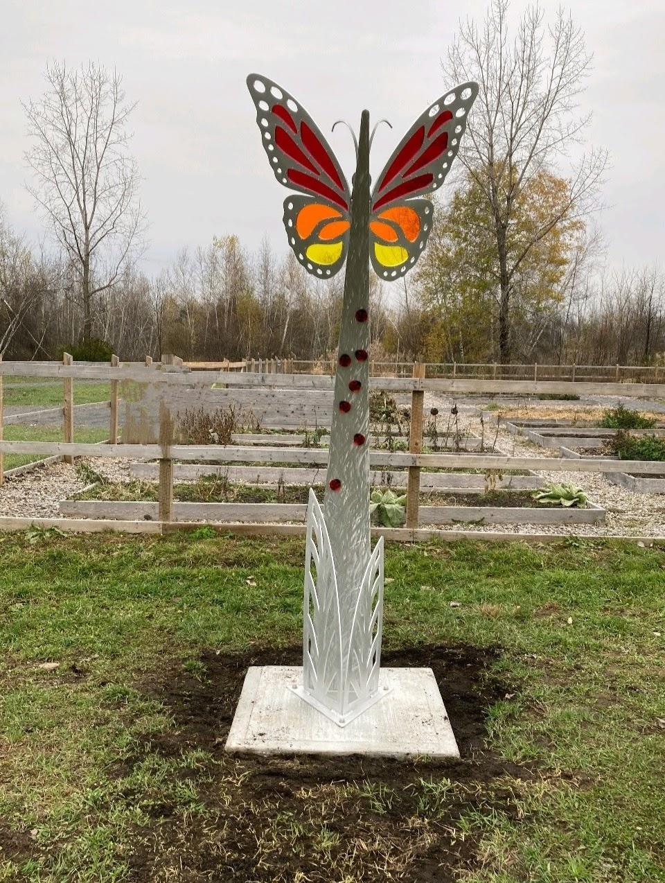La sculpture « L’Envol », représentant un papillon, réalisée par l’artiste Edith Cantin, accompagnée d’un projet de médiation culturelle avec les élèves de l’école des Étriers, dans le jardin communautaire de la Cité des Papillons.
