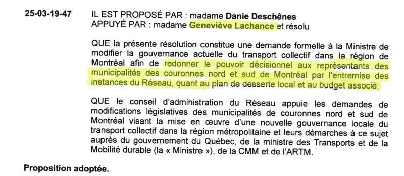 En mars dernier, j’ai appuyé à la MRC de Vaudreuil-Soulanges une résolution demandant au gouvernement du Québec de réformer la gouvernance afin de redonner plus de pouvoir décisionnel aux municipalités en matière de desserte et de budgets.